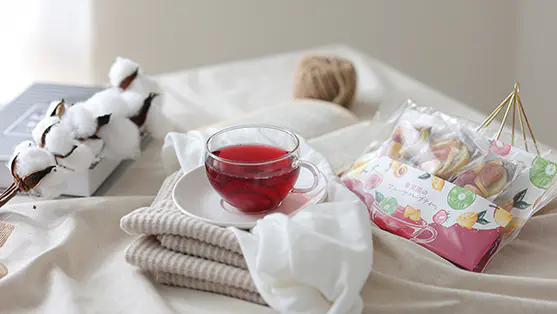 ビタミンC豊富なローズヒップ+ハイビスカスのハーブティーに大きめドライフルーツブレンドが加わって健康とキレイにうれしい‘ほっと癒される’可愛くて美味しいおすすめの果実園のフルーツハーブティー。